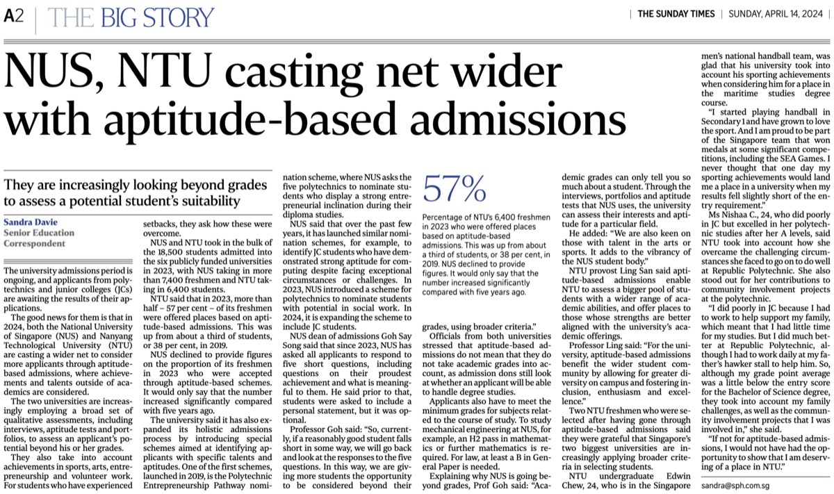 NTU said that in 2023, more than half - 57 per cent - of its freshmen were offered places based on aptitude-based admissions.